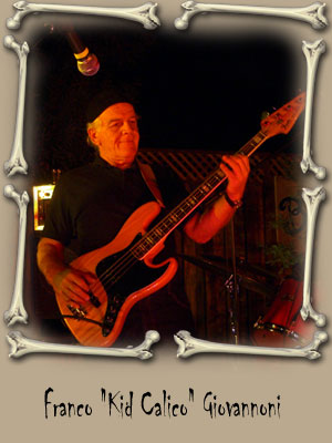 Biography: Franco "Kid Calico" Giovannoni Bass Guitar I started playing guitar when Surf music was popular. In fact, I showed OBD his first bar chord, and he went off running with it. I went through the British Invasion and in about 1967, I started playing bass. I was listening to Paul Butterfield and other blues artists of the time, and I fell in love with the blues. I went through the San Francisco sound and survived that. Then I fell in to the cosmic cowboy thing. Popped out of that, and went to Country Rock & Swing music. Somewhere in there I rubbed elbows with OBD again in a band called "Dickey Do & the Don'ts", OBD was Dickey. We did 50's Rock & Roll. Then I jumped in to the Country Rock and Swing while playing with "Windfall". Then I worked my way back to Rock & Blues music. So, here I am, playing with "Sleeper" and "Bone Jelli" . I've known most of these guy's for years, and they've turned out to be fine musicians. And, I'm glad to playing bass with them. When I started out, I had red whiskers and end up with white ones. But, all in all, it s been fun through out the years, beers, and tears. (And God willing) Many more years. |