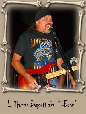 Biography: L. Thomas Baggett aka "T-Bone" Lead vocals, lead & rhythm guitar L. Thomas Baggett, affectionately known as "T-Bone", was born in Sacramento, CA, December 9, 1955. His music career began at the age of 5 as he would sing and perform skits for his terminall ill grandfather, Jam R. Adams, a coal miner who was stricken with black lung disease and, and eventually passed away at the Weimar institute in Weimar, CA. At the age of 8, L. Thomas began playing guitar by ear as the family could not afford lessons at the time. He was voted the most talented senior at Roseville High School in 1974. By 1975 he was playing music in Houston, TX. Hi band "Amoranth" played for the official Apollo.Soyez Splash Down Party, where he got to meet his childhood hero, Neil Armstrong. Since then, he has played music professionally in the San Diego, Sacramento, and Seattle areas. In the late 1980's he began playing with signed country act known as "Debra Gayle and El Dorado", where his favorite memory was opening up for another hero of his, "The Living Legend", George Jones, at the Visalia Community Center in front of thousands of screaming fans. In 1995, L. thomas became a published song writer. His song "These things" was recorded by Australian Country Music star Kate Ballentyne" as track number 6 on her CD "Tomorrow's Girl", which landed at Number 1 on the Australian Country Music Charts. In 1996 his band "Straight from the Heart" along with his friend and song writing partner, Colleen Lloy won the Sacramento area James Dean True Value Hardware County Music Award. After which they represented Northern california during the National Finals. As for now,after an 8 year hiatus, L. thomas is working with his more recent founded project known as "Bone Jeli". Along with an arrayof talented players, such as John Noxon, Stan alves, Kenny "Obie Dee" Van Cromphaut, Donnie Baker, Darlene Taylor, Greg Smith, Franco Giovannoni, Kurt Schultz, Rootbeer, and Marty Deradoorian. L. Thomas feels as though he has been truly blessed to be in the company of these fine players, and is looking forward to working and performing with "Bone Jelli". |